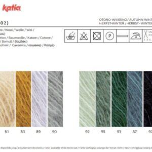 1. white10. very l.beige -..12. grey13. medium grey14. very dark grey15. very dark green17 petrol18. pistachio2. black20. deep orange23. dark maroon24. dark fuschia25. rose26. medium rose28. dark lilac3. off-white30. turquoise32. grey blue34. sky blue35. camel38. very light grey39. green blue4. red40. light fuchsia41. mustard5. very dark blue62. light pink66. coral68. fawn brown69. dark rose70. khaki71. ochre72. jeans73. water blue74. dark rose75. raspberry red76. lilac77. light lilac79. light beige8. dark grey80. pastel green84. pastel yellow85. very light green9. light grey